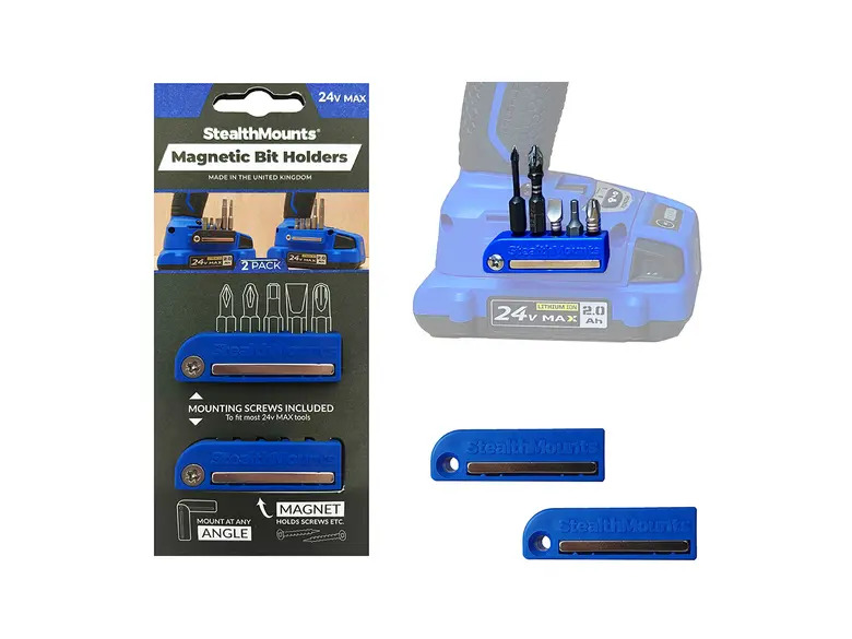 StealthMounts Bit Holders for Kobalt 24v are the perfect addition for your drill or impact driver. This bitholder keeps your bits together, organised and on your drill or impact driver. Our Kobalt 24v Bit Holders come in a pack of 2. Each magnetic bitholder can hold up to 5 bits allowing you to access your most common drill bits ensuring that you never lose track of them. The appropriate screw for mounting to most of your Kobalt 24v tools is provided. The magnet allows the bitholder to be mounted to the tool at different angles, extra screws can also be stored on the side of the magnet. Bits wont fall out even when the holder is mounted upside down. Made in Great Britain our Kobalt 24v Bit Holders are made with extremely durable injection moulded ABS plastic.